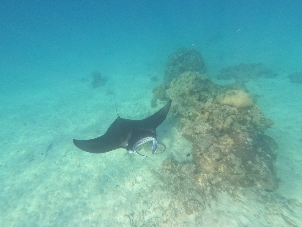 Dernière escale au motu de l’ancienne ferme perlière, au centre de l’atoll où les raies mantas viennent parfois se faire nettoyer. La chance est avec nous, car nous rencontrerons la reine du lagon dès notre première plongée. Nous resterons longtemps à la regarder évoluer doucement en glissant dans l’eau. Elle ne semble pas du tout gênée de notre présence alors nous essayons quelques figures d’approche. Magique !!